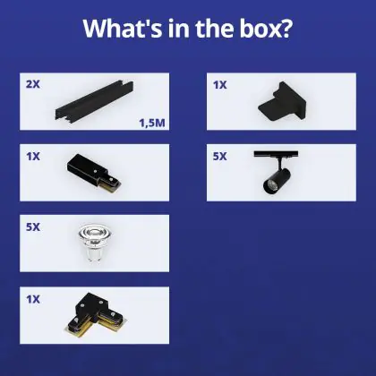 | Manufacturer Name | Complete L shaped 1-Phase Track Set Black incl. 5x Spot fixture + GU10 2700K 3W Dim – 1,5 x 1,5 mete | |