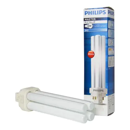 Philips PL-C 4P are compact fluorescent lamps with separate power supplies, without a starter or capacitor. This model is very energy efficient and is equipped with a 4 pin socket. Philips PL-C Xtra 18W 840 4P have a G24q-2 socket type and measure 114 cm.