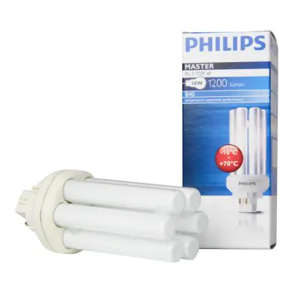 Philips PL-T TOP 18W 840 4P providing light at a colour temperature of 4000K, which corresponds to a cold white light. The colour rendering index is also excellent, more than 80Ra. Philips PL-T TOP 18W 840 4P are very energy efficient: their energy label is classified A. Philips PL-T TOP 18W 840 4P lamps also have a very long lifespan, 13000 hours on average!