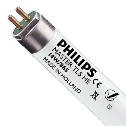 Philips TL5 High Efficiency (HE) fluorescent tubes have a very small diameter: 16 mm and a G5 base. They have lower power and therefore consume less energy while still providing a high luminous flux. These tubes are compatible with an electronic ballast.